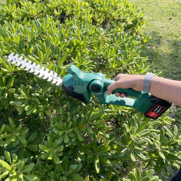 This new green lithium hedge trimmer is our latest offering, equipped with two blades for easier pruning and hedge trimming. You can change the blades according to your needs. The blades can be adjusted up to a 90-degree angle, making trimming corner plants simple. It also features a safety switch to ensure user safety.